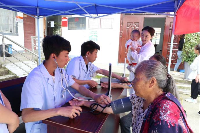 (护理系师生为龙山村村民测量血压)
